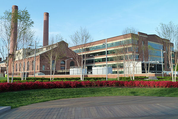 A wider shot of the plantings and boardwalk, with the Navy Yard buildings. (link)