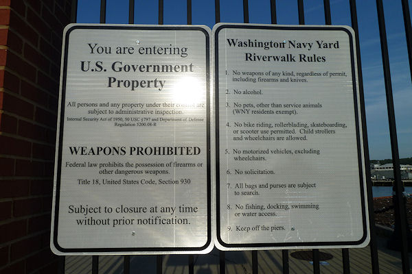 On April 1, the Navy Yard began allowing limited access to its portion of the riverwalk, but only from 8 am to 5 pm Monday-Friday. So I was out of luck. (Note the forlorn shadow behind the fence at bottom.) (link)