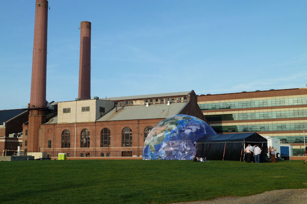 A wider shot of the tent, with Navy Yard buildings behind it. (link)