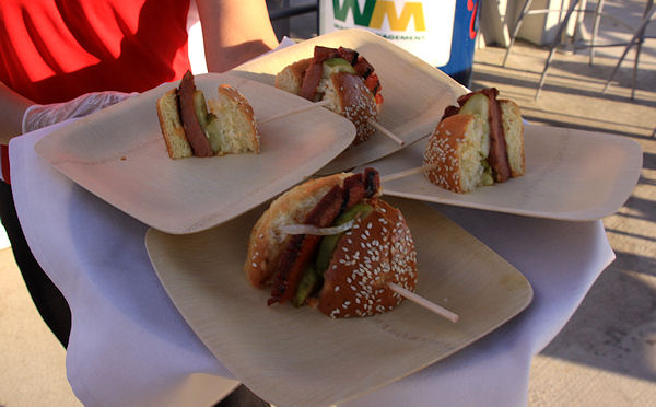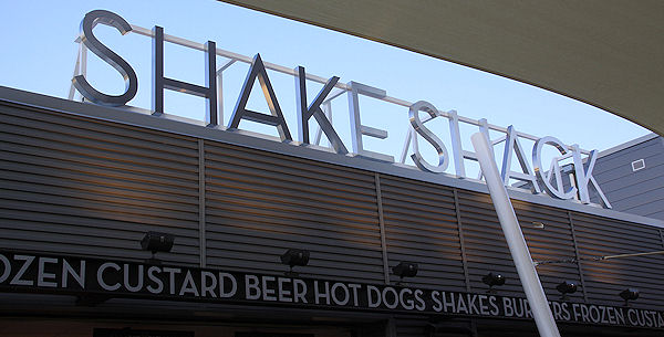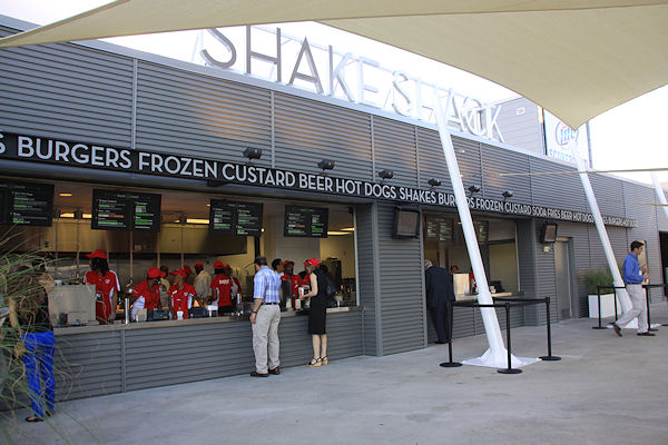 Looking down the row of restaurants, showing the sails that will help shade fans while standing in line. They are designed to reduce the ambient temperature by up to 20 degrees. (link)