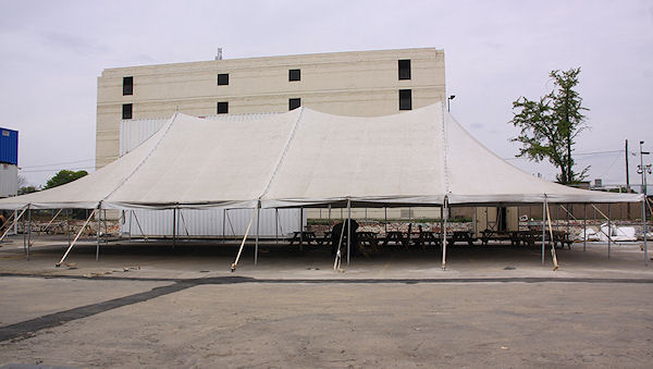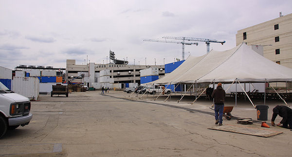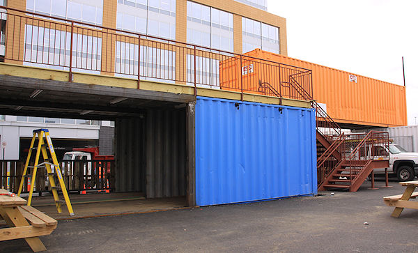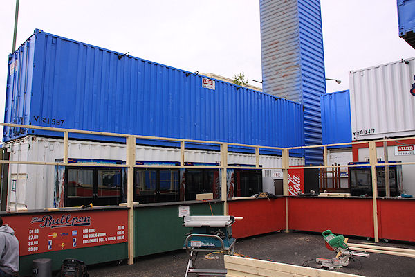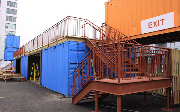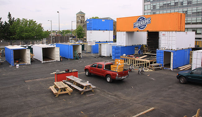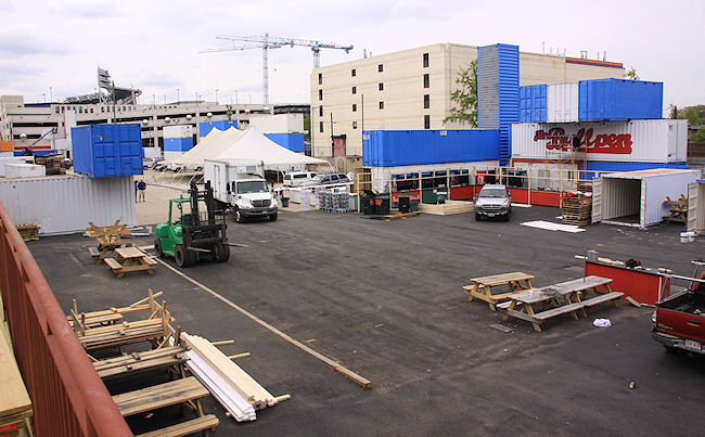 Looking down at the stage, and some of the vendors' container spaces. (link)
