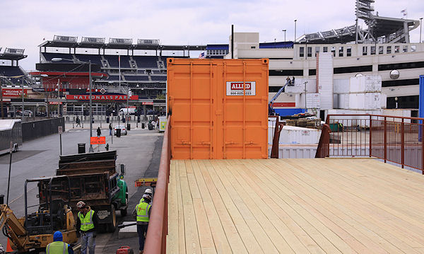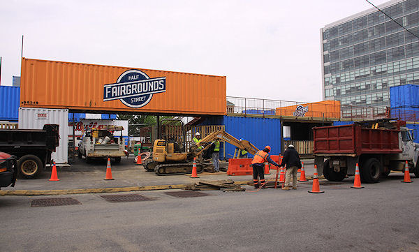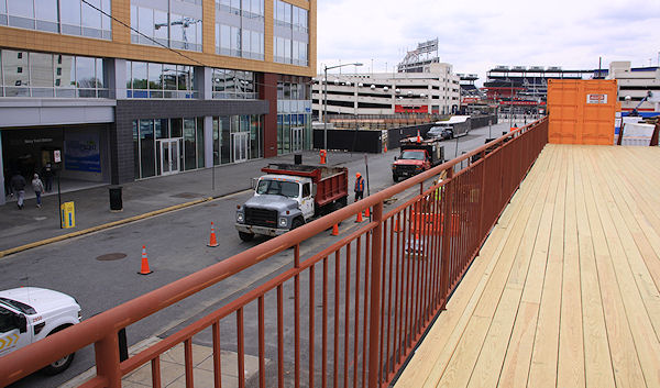 A wide view of the main space, as seen from the viewing platform along Half Street. On non-game days, the space will be cordoned off about where the delivery truck is. (link)