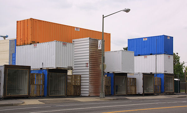 Containers along M, now with glass so that passers-by can see in to the vending spaces. (link)