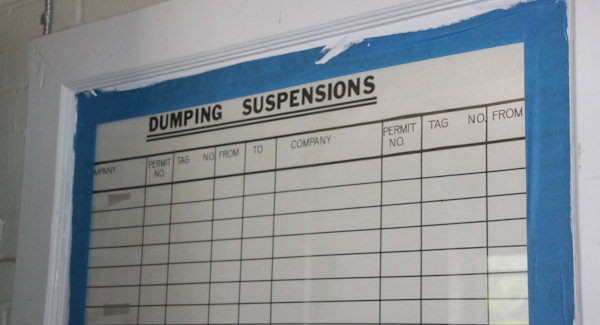 What appears to have been the main office. On the wall is a framed certificate congratulating a DPW employee for outstanding achievement during the 2007-2008 leaf season. (link)