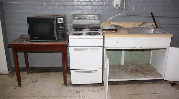 The break room on the lower level. Not pictured are the backgammon set, the random barbell weights, and the pressed uniforms hanging in a few lockers. (link)