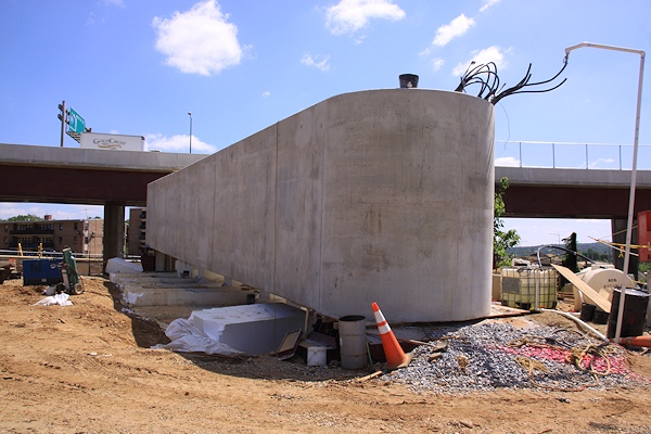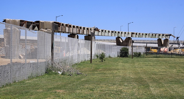 go here and look at the graphics.) At center/right is the construction of what will be the new flyover ramp to the outbound 11th Street freeway bridge. And at far left is the renmantz of the old outbound flyover.