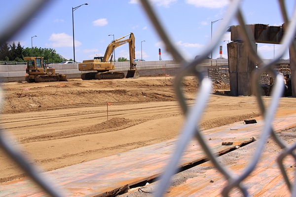 What 11th Street at the freeway now looks like. At the far far right is the same embankment as in the previous photo, which now only rises a small amount above ground level because the sunken freeway has been filled with dirt. There is no more "bridge" on this side of 11th Street, because the new Southeast Blvd. will arrive to a signalized intersection at this location, having only dropped a few feet from the freeway's height to the west. (It's really hard to explain, so just