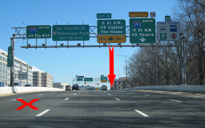 The first sign, instructing drivers who wish to get off at C Street SW for the US Capitol and House office buildings to get in the second lane from the left (though it's hard to tell which of the left lanes the sign is pointing to). Before the bridge was reconstructed, this sign was placed over the second-right lane, with the 395 sign nudged further to the right, which wasn't absolutely correct either but was closer to being accurate.