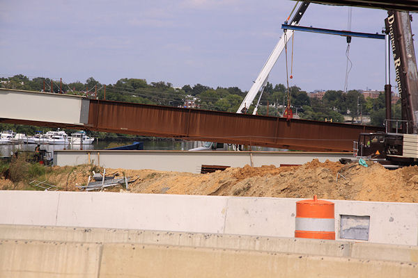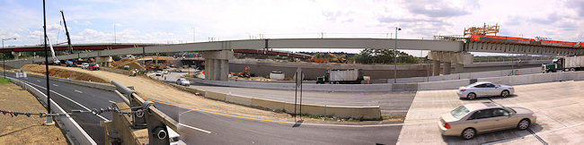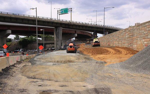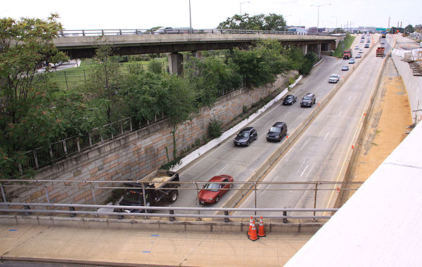 An overhead view rom above 11th Street of the sunken Southeast Freeway lanes. The right lane seen here has already been closed, and by early 2013 all traffic in both directions will be closed to begin work on the