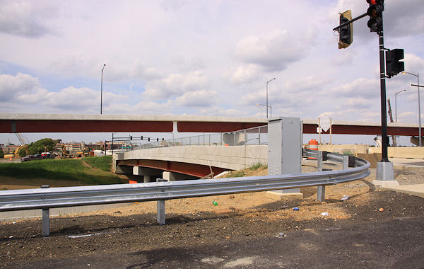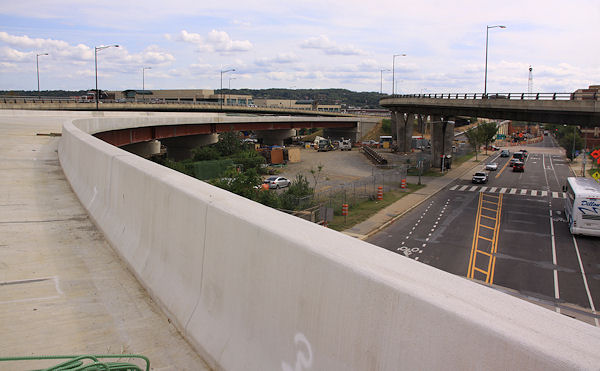 at-grade Southeast Blvd.. The filling in will begin in the distance where you see the grass shoulder, running to 11th Street, seen below in its current bridge format but which will be replaced with an at-grade street, and then onto 13th Street. There will also be a new flyover ramp from the Southeast Freeway to outbound I-695, replacing the flyover seen at top.