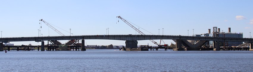 November 3, 2019 - Looking down river at the old Douglass Bridge, with the construction of the new one finally becoming visible on the existing bridge's other side. The "V"s are the bases of the new bridge, as seen in the rendering.