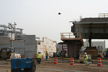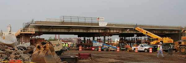 The same angle, seven hours later, and about 90 minutes before the lowering was completed. Look at the silver hydraulic jacks to get a feeling for the amount the bridge has been lowered. (7/19/07)