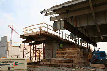 The underside of the northern edge of the ramp, at the two-hour mark; you can see the hydraulic jacks, with four feet of lowering still to go. (7/19/07)