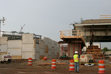 This is the bridge's northern edge one hour into the process; the new earth-fill ramp up from Potomac Ave. is at left. (7/19/07)