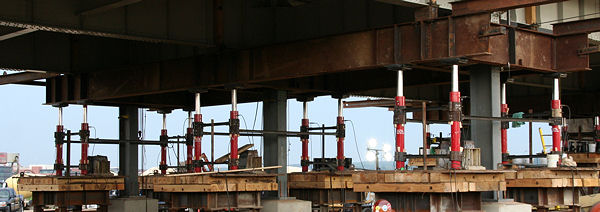 A closer view of the configuration of the jacks and the new columns, one hour into the lowering. (You can see one of the sheared-off old columns still hanging from the bridge in the center.) (7/19/07)