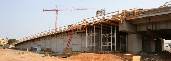 The same spot, seven hours later. Look at the silver jacks to tell the amount the bridge has been lowered. The new columns are in place as well. (7/19/07)