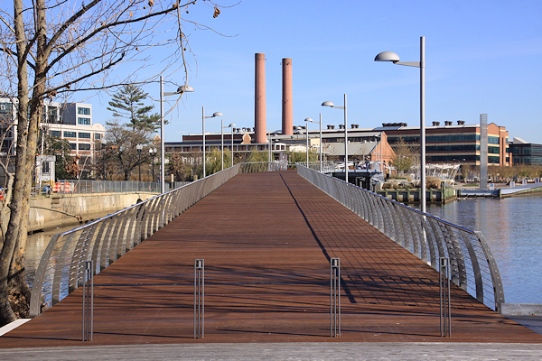 The water taxi pier, with its view of the Navy Yard, the display ship Barry, and the